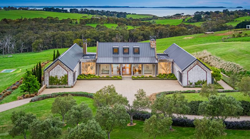 A single-level main dwelling with five bedrooms and four bathrooms captures rural and bay views, including to Phillip Island.